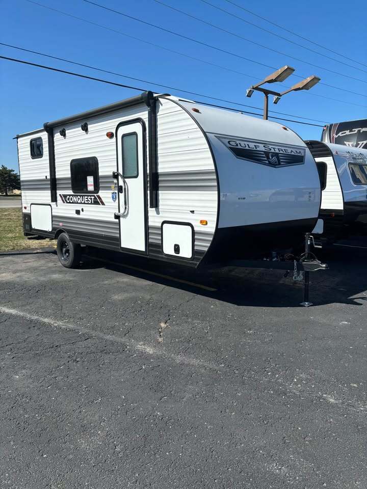 Take a look at our 2024 Gulf Stream Conquest 197BH. The 197BH would be a great trailer for small families. With the Murphy bed in the up position, this single-axle trailer has room to enjoy the day couch. It is fitted with everything you need for your “home-away-from-home.” The kitchen has a 2-burner cooktop with a vented hood, a microwave, and a decent-sized refrigerator. At the rear are the double-over-double bunks. Get out of the sun on those hot summer days underneath the awning and enjoy food and beverages straight from the outdoor kitchen!