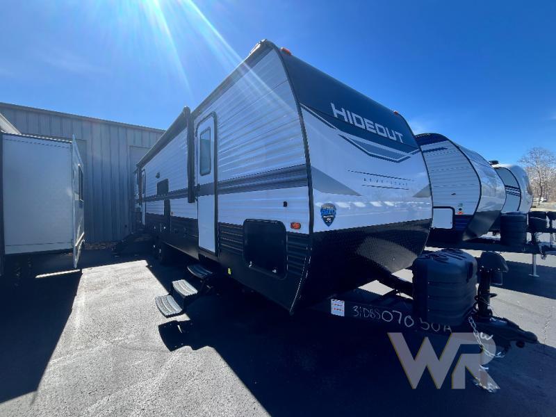 The perfect family-friendly travel trailer is found with this Hideout travel trailer. The kids or your guests will love the rear bunkhouse with a half bath, while you take the front private bedroom with the spacious full bath close by. The large slide out in the middle living area will provide everyone space to move about, and you'll find a booth dinette and sofa here. You can also choose an optional tri-fold sofa or optional theater seating in place of the standard sofa, depending on your needs. This model also features dual entry doors, outside storage under the bunks, an 18' power awning, and a power tongue jack; what's not to love!?