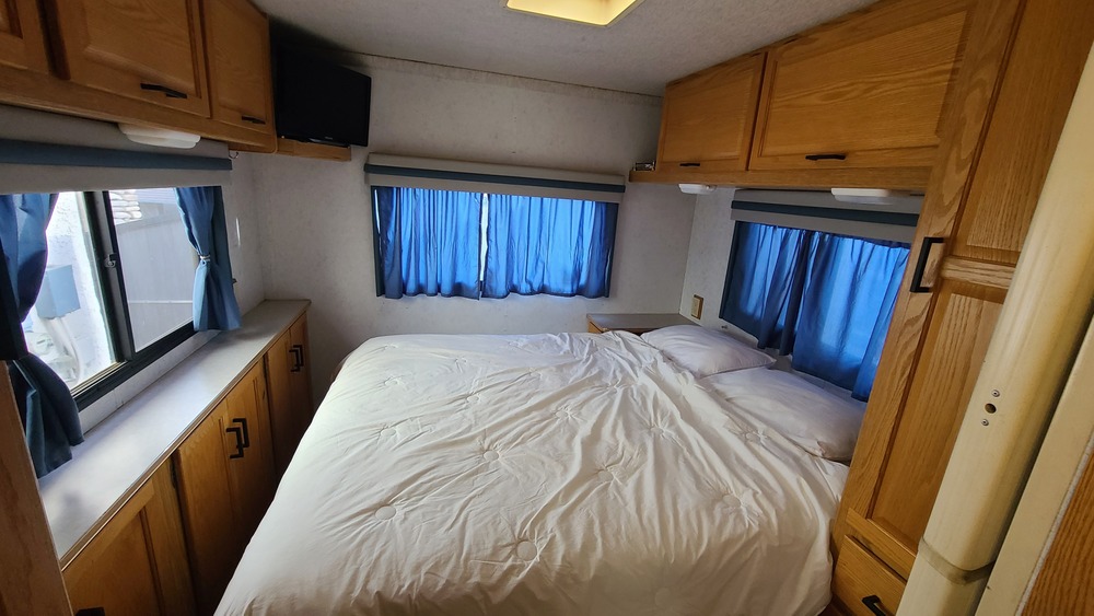 Sleeping arrangements are comfortable and ample in this RV, with a large bed in the back and additional sleeping space in the overcab bunk. The bathroom is convenient and functional, featuring a shower and toilet for added comfort and convenience.