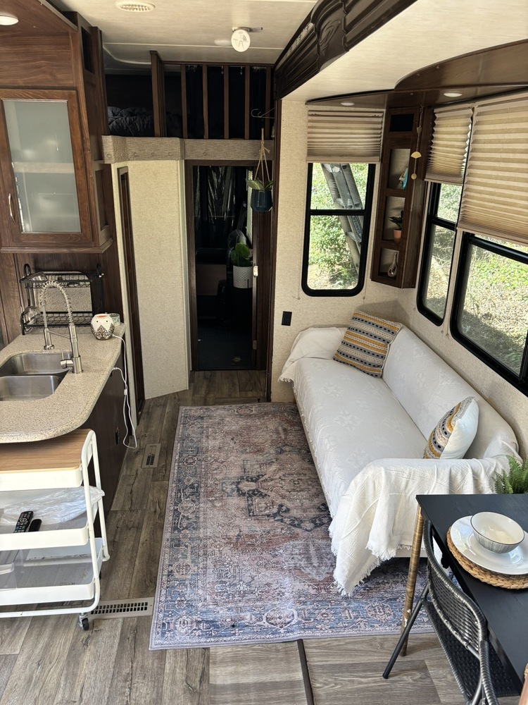 This toy hauler comes fully equipped w heating and AC. Two full bathrooms: one in the master suite and another in the toy hauler area. The master bedroom is expansive, large closets, extra storage space beneath the queen bed. The living area includes a couch, table, brand new fireplace, and a large flat-screen TV. All three TVs through the RV are equipped with Roku. The toy hauler features a loft, a designated desk area, and an additional leather couch. The kitchen has a three-burner stove, an oven, a microwave, and a spacious refrigerator. It has its own central vacuum system. It comes with a 3-year-old washer-dryer combination as well as coffee maker, toaster, pots, pans, dishes, and bedding. The roof has recently been fully sealed.