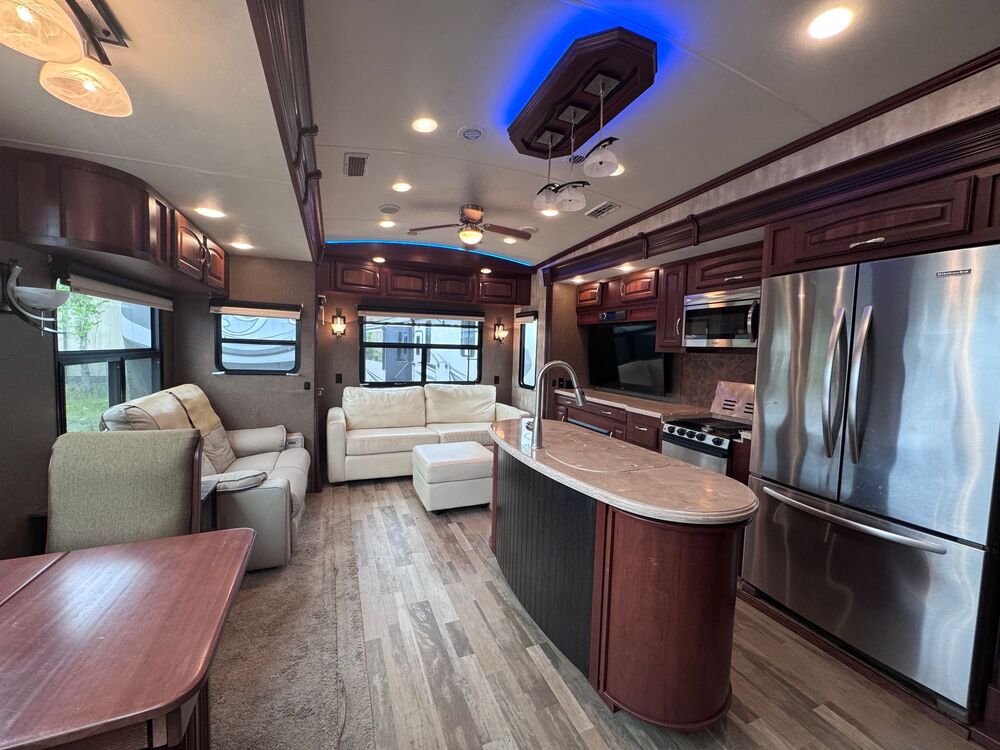 At the heart of this RV is its thoughtful design, seen in every corner of the spacious 39FB layout. As you step inside, you're welcomed by an expansive living area adorned with premium finishes and modern conveniences. Whether you're embarking on a cross-country adventure or setting up camp in your favorite spot, enjoy the plush seating arrangements, a fully-equipped kitchen with ample storage, and a smartly configured dining area that caters to both intimate dinners and larger gatherings. The bedroom serves as a peaceful retreat, featuring a comfortable, king-sized bed and plenty of storage space for your essentials. Moreover, the spacious, upscale bathroom comes with elegant fittings and finishes, ensuring you have a relaxing experience after a day filled with exploration.