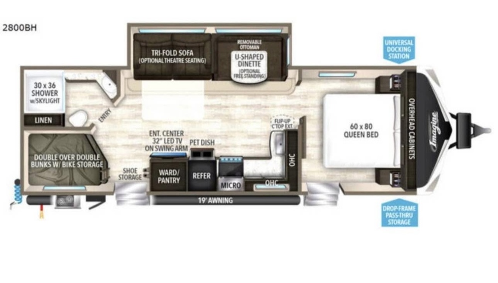 The 2018 Grand Design Imagine 2800BH is a top-of-the-line travel trailer designed for luxurious and comfortable camping experiences. This model offers plenty of space for families or groups of friends with its bunkhouse layout. The bunkhouse features multiple sleeping arrangements, making it perfect for accommodating guests or children. The main living area is spacious and well-designed, with high-quality furnishings and modern amenities. The kitchen is fully equipped with appliances, including a stove, refrigerator, and microwave, making it easy to prepare meals while on the road. The bathroom is also well-appointed, with a shower and toilet for convenience.