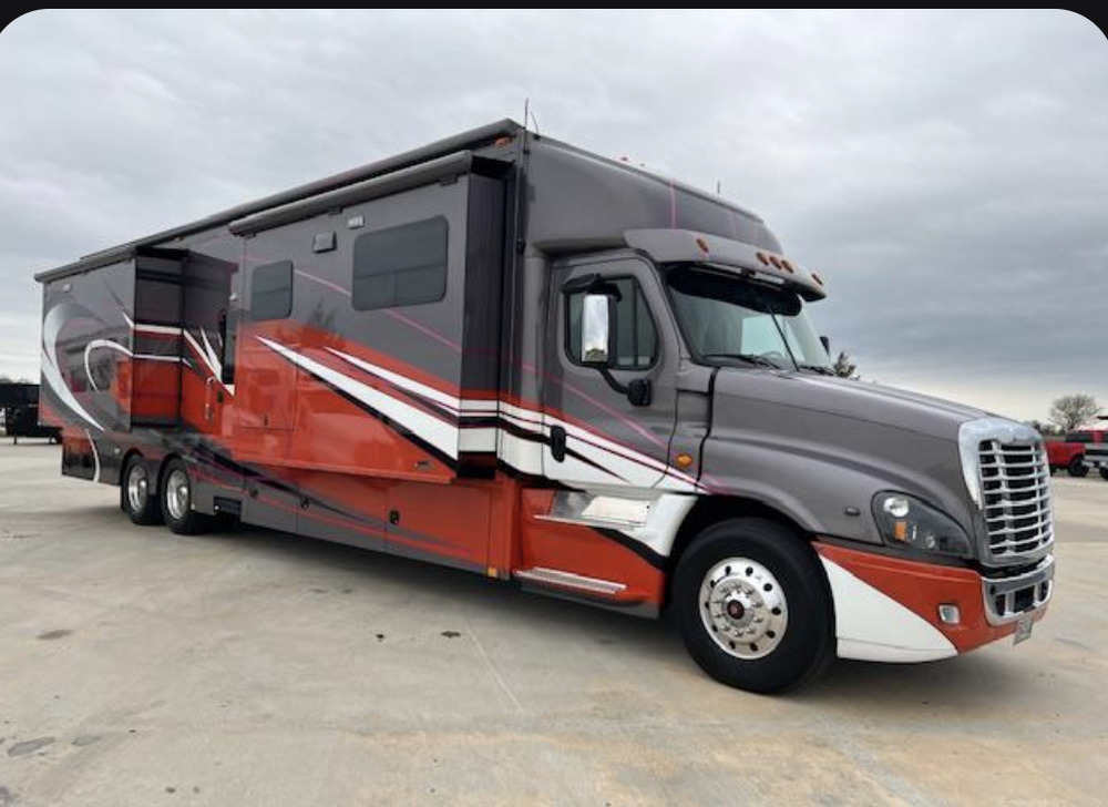 Renegade Classic Quad Slide Cascadia Model 3400, Cummins 600HP, Allison 6 Speed Automatic, 38K Miles, Full Custom Paint, 12.5 Onan Diesel Generator (1205hrs), Heated Tile Floors, Aqua-Hot Heat/Hot Water System, Side By Side Stainless Residential Refrigerator/Freezer, Glass Cooktop, Convection Microwave Oven, Solar Panel Charging System, Black Leather, Hide-A-Bed Sleeper Sofa, Jack Knife Sleeper Sofa, Mid Bath Floor Plan W/Big Shower, Private Toilet Closet, Solid Surface Countertops, Glass Tile Backsplashes, Washer/Dryer, High Gloss Woodwork, Big Flat Screens, Dinette, Dual Magnum Inverters W/Auto Start, Power Awnings, Outside Entertainment, 4 Corner Auto Leveling, Back-Up Camera, Turn Signal Cameras, Glad Hands, 30K Hitch, Power Shore Cord Reel, Stereo, Many Many More Options. For additional information and pricing please call Richard Freeman 405-640-2366 or Michael Brotherton 214-202-0884 or Royce Lee Freeman 405-831-9594 or Erica Enders 713-299-7598 or Alan Cape 573-259-0666 Elite Motorsports, LLC