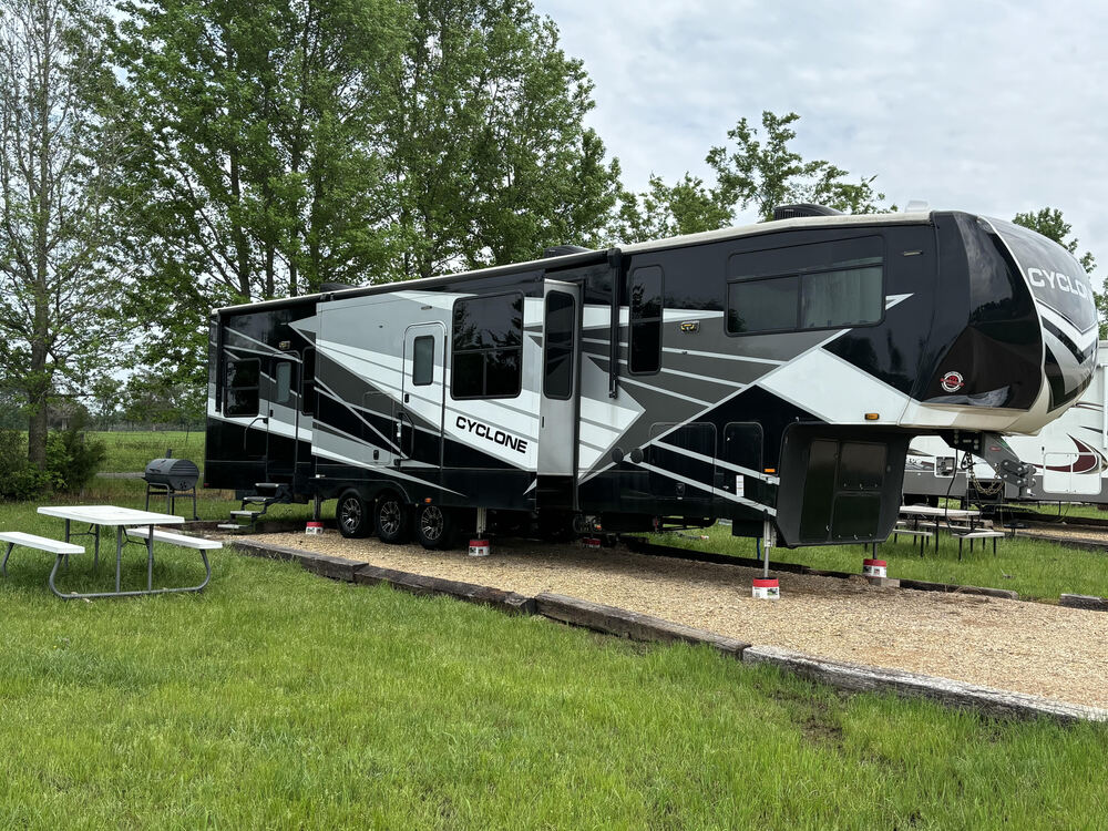 Length: 43.5ft - Width: 8.42 Ft - Height: 13.25 Ft - Dry Weight: 16,844 lbs - GVWR: 20,000 lbs Fresh Water Tank: 100 gal Black Water Tanks (2): 91 gal Grey Water Tanks (2): 60 lbs Slideouts: 3 - Power Awnings: 3 - Generator: Onan 5500 Magnum Inverter - Outdoor fridge and Blackstone mini griddle - Outdoor speakers - Ready for solar panels - Queen bed on happyjac system in toy hauler room with twin loft - Convertible desk/dresser in master. Factory Upgrades: 15K BTU Dometic AC for rear room $1,400 - Yeti Cold Weather Package $1K (heated holding tanks, heated water line, additional underbelly insulation) 3 Season Removable Wall $700 - Full Body Black and White Paint $14K - Residential LG Fridge $1,500 - Slide Toppers - Additional Upgrades: Home Reserve Tux Leather Loveseat Sofa (Cantina Peanut color), Levelor Light Filtering Tatami Roman Shades - Custom Blackout Shades in Bedroom -Collapsible Dining Table - Custom Lighting LG ThinQ Washer/Dryer Combo (larger size) - Toy Hauler room completely painted with new LVP oak flooring. Ruggable Rug 5X7 Machine Washable Rug - 8x8 curtains - Gen Y Fifth wheel to gooseneck hitch 3.5K - 5.5K pin weight. All furniture and blinds/curtains in photos to be sold with the RV - We lived stationary for about 2 months. Roof was re-coated once and regular maintenance was performed on hydraulic system prior to purchase.