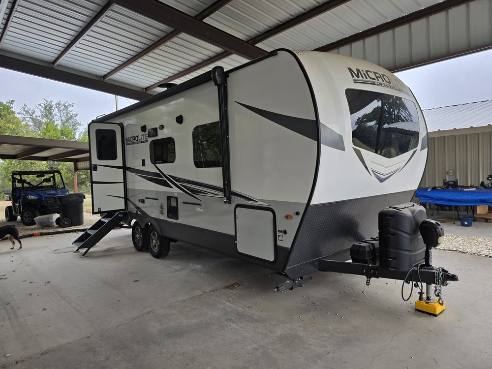 Excellent Condition. Barely Used. Perfect length for weekends and/or long trips and easier to fit into short rv sites. Must sell due to worsening macular degeneration. Living room slideout. Bedroom slideout. RV queen bed. Elec/gas refrig. Microwave. 3 burner stove and oven. Elec fireplace. Elec/gas hot water heater. NEW elec double recliner w/power to console. Rear bath. Large shower. 200W solar panel. 13,500 BTU AC. Full length elec awning. Outdoor grill. Outdoor shower. Pass thru storage. Rear view camera. 27,900 or OBO. Contact for more info.