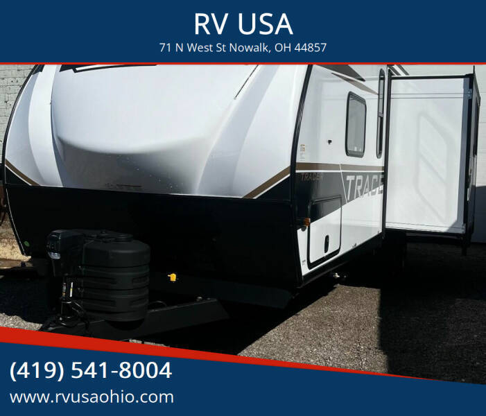 Discover the Tracer 24RKS, a rear kitchen model that perfectly combines convenience and comfort with its two entry doors. Step inside to find a cozy main bedroom at the front, complete with a luxurious 60" x 80" queen bed, ample storage cabinets, and solid doors for enhanced privacy. Enjoy the bright and spacious bathroom featuring two skylights, a stylish radius glass-front shower, an extra-wide vanity, and a handy medicine cabinet. The slide-out area boasts a versatile booth dinette with under-bench storage that easily converts into a sleeping surface, along with a pop-up TV for your entertainment needs.