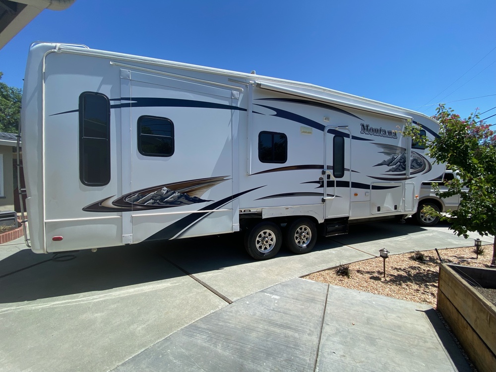 Beautiful 2011 Montana by Keystone 5th Wheel, 3150RL for sale. At 34, with 3 slide outs and 9 living room ceilings, this unit is spacious and lovely. It comes with all the standard features expected with this model including 2 flat screen TVs, an electric fireplace, 3 burner gas stove, gas oven, electric microwave/convection oven with vent, Norcold refrigerator that operates on either 120 volt or LP gas, well maintained Corian countertops, large double closet, 6 drawer dresser, king bed with memory foam topper and organic cotton mattress cover, porcelain toilet meticulously kept with no stains, built in vacuum, rooftop installed Dish and Winegard antenna system, electric A/C unit and gas furnace, 12 gallon gas/electric water heater, washer and dryer hookups, and loads of storage both in the unit and below. Convenient remote control to deploy hitch, jacks, and slides from outside the unit.