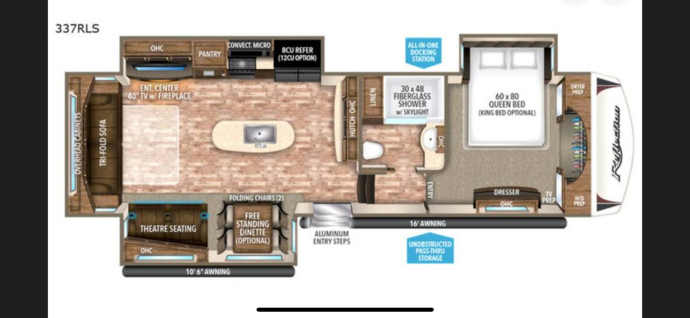 Step inside this Reflection fifth wheel model 337RLS by Grand Design and be pleasantly surprised by what you find inside. You will enjoy all the comforts of home in a convenient rear living layout.You will love the dual opposing slides in the main living area of this unit which creates a wide open feel with plenty of walking around space. Theatre seating with storage above and cup holders for two. A hutch with overhead storage is located straight in from the main entry door. The slide on the opposite side of the room features an 8 cu. ft. refrigerator , a food pantry, and three burner range with convection microwave above. This slide also features a 40" TV, and an entertainment center with fireplace below.The rear wall provides added seating and sleeping space with a tri-fold sofa including overhead cabinets above. There is a center island with a large kitchen sink, and plenty of counter space too.Step up to a side aisle bath with a toilet, sink, fiberglass shower with skylight, and a linen cabinet.The front bedroom features a queen bed, dresser, TV prep, front wardrobe with sliding doors including washer/dryer prepped space, plus so much more! You are sure to enjoy the exterior unobstructed pass-through storage, two awnings, and all-in-one docking station.