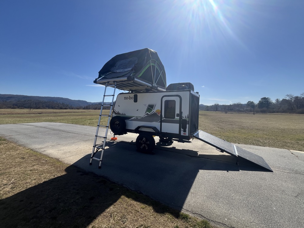 2023 Nobo 10.6 with beast mode independent suspension and lift. The camper comes with a rooftop tent (2 adults), 270 degree batwing awning (see last pictures - too windy during listing photos), and kayak holder. Also, it is equipped with a blackstone griddle, truma cooler, electric heat/ac, TV, and 30 gal fresh water tank.