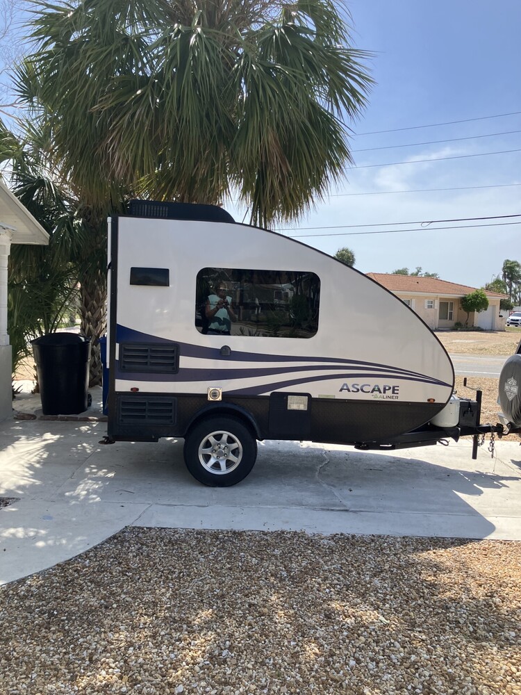 Hard to find Aliner Ascape In excellent condition. It was used only as an Occasional sleeper. The appliances, toilet and shower have never been used. Only real flaw is the solar panel on roof looks a little sketchy. If you're looking for a 13 ft 2200 lb travel trailer this is a good one. It is equipped with roof air, hot water tank, Furnace, range hood with light, microwave, TV, 2 burner stove, three way refrigerator with Freezer, indoor cassette toilet and outside shower with hot water. comes equipped with electric brakes and good tires also a spare. Very nice rig for someone looking for a small space to camp in. Good possibility of Delivering the camper middle of may anywhere between Florida and Minnesota.