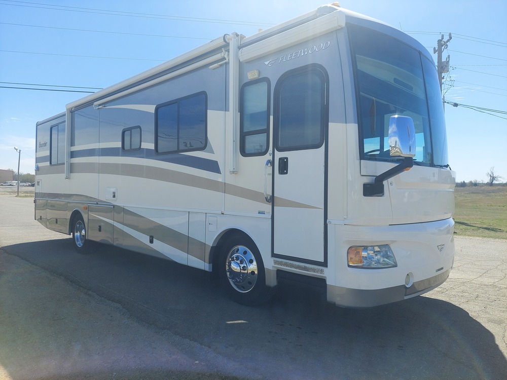 Very nice well maintained 2 owner coach. Always stored under cover. Cat engine upgraded to 350 hp by Cat dealer. The inteior has been remodeled with MCD roller blinds($4500) paint and accent trim. Coach is 34 feet 6 inches long with 3 slideouts. 7.5 kw Onan generator. Two new 15000 btu AC units with heat pumps. Winegard Directv Trav'ler satellite system. Aluminum wheels.