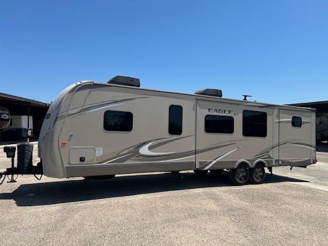 2017 Jayco Eagle HT 324BHTS **SALE PENDING** is large and can sleep 9 comfortably. The Eagle HT line was designed to be towed by a half-ton (HT) vehicle that is equipped with a trailering package. The fully loaded trailer weighs less than 10,000 lb. This model has a rear bunk house, outside kitchen and three slide outs - living room, kitchen and bunkhouse bedroom. There are two TV's, one in the living area and one in the outside kitchen. There are two AC units. Electric is 50 amp. The Jayco Eagle HT is known for its quality construction and attention to detail.