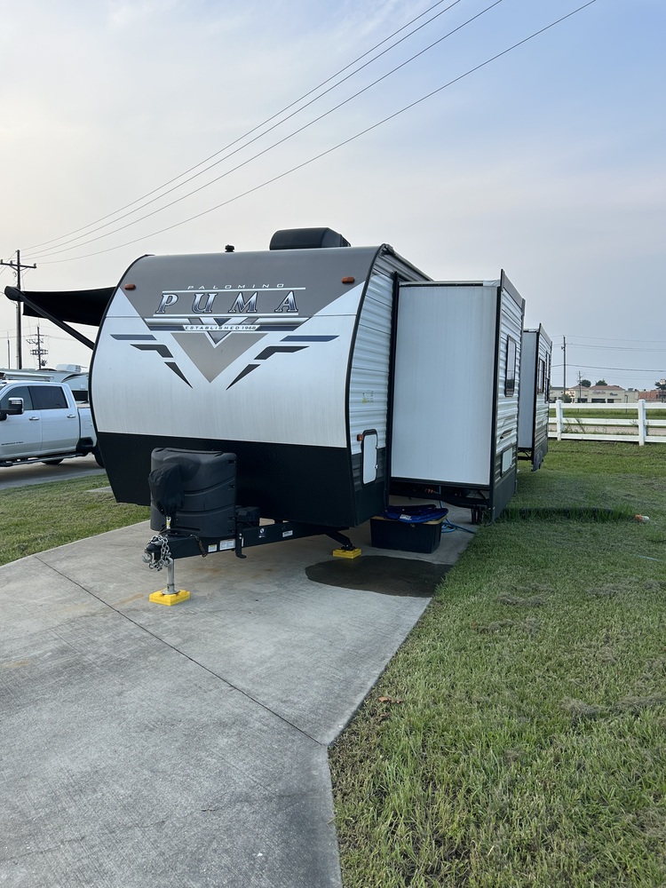 2021 Forest River Puma Model #30-RKQS couples trailer. Excellent condition. Separate bedroom with door, large closet, and separate closet with washer/dryer hookups. Two a/c units. Queen bed with upgraded hybrid mattress ($1700 value). 2 slide outs (drivers side, bedroom and living areas), sleeps 4-6, fireplace, flat screen tv, large refrigerator, full size pantry, 21 awning. Outdoor kitchen with refrigerator and black stone grill. All accessories for travel included - sway bar towing package, x-shaped chocs for tires, chocs behind tires and under electric stabilizer bars. Portable dump tank and two 20# propane tanks included. Currently located in Willis, Texas.