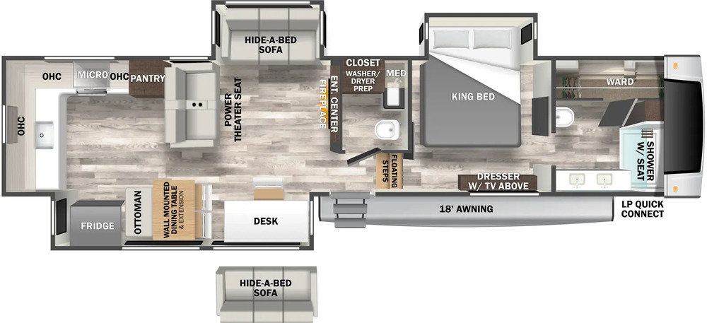 At 38 feet in length, this fifth wheel offers plenty of space for living and entertaining. The rear kitchen layout is unique and functional, with ample counter space and storage for all your cooking needs. The living area is comfortable and stylish, with a cozy fireplace and large windows for plenty of natural light.