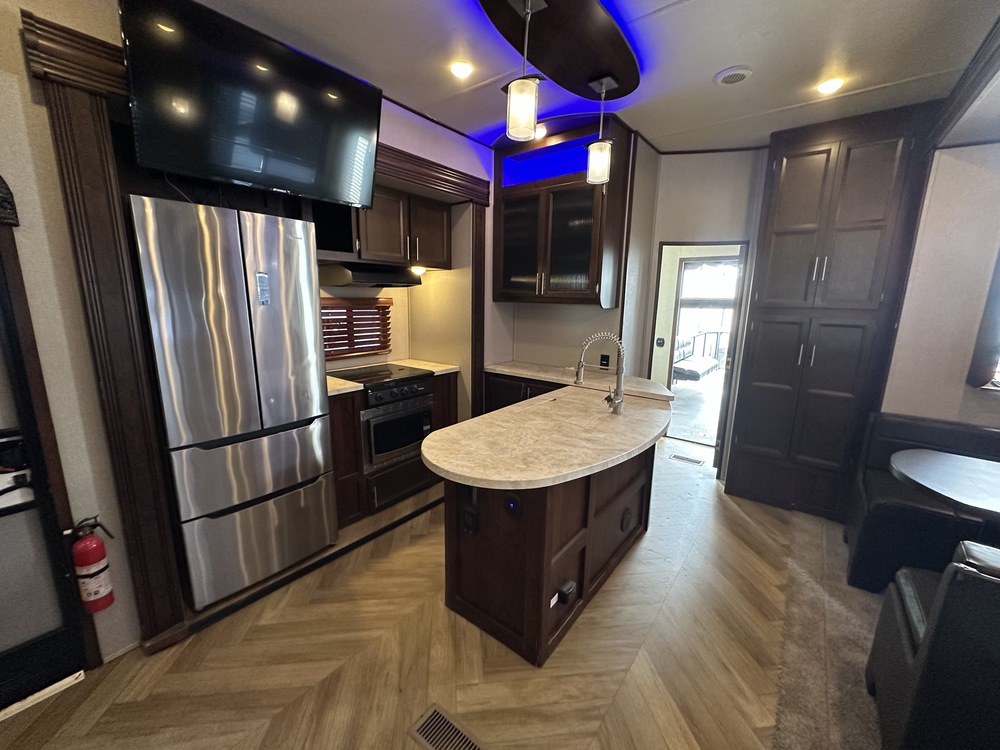 Step inside to discover an impeccable interior layout that speaks luxury at every turn. Featuring an expansive 12-foot garage space, the Vengeance 420V12 allows you to bring along your favorite recreational vehicles and toys with ease. The plush living area is equipped with premium furnishings that offer both style and comfort, perfect for unwinding after a day of adventure. A fully-featured kitchen boasts stainless steel appliances and ample counter space, presenting an inviting venue to cook culinary delights at your convenience. You'll have no trouble accommodating guests or family thanks to its spacious sleeping quarters, including a master suite that promises restful slumber under the stars.