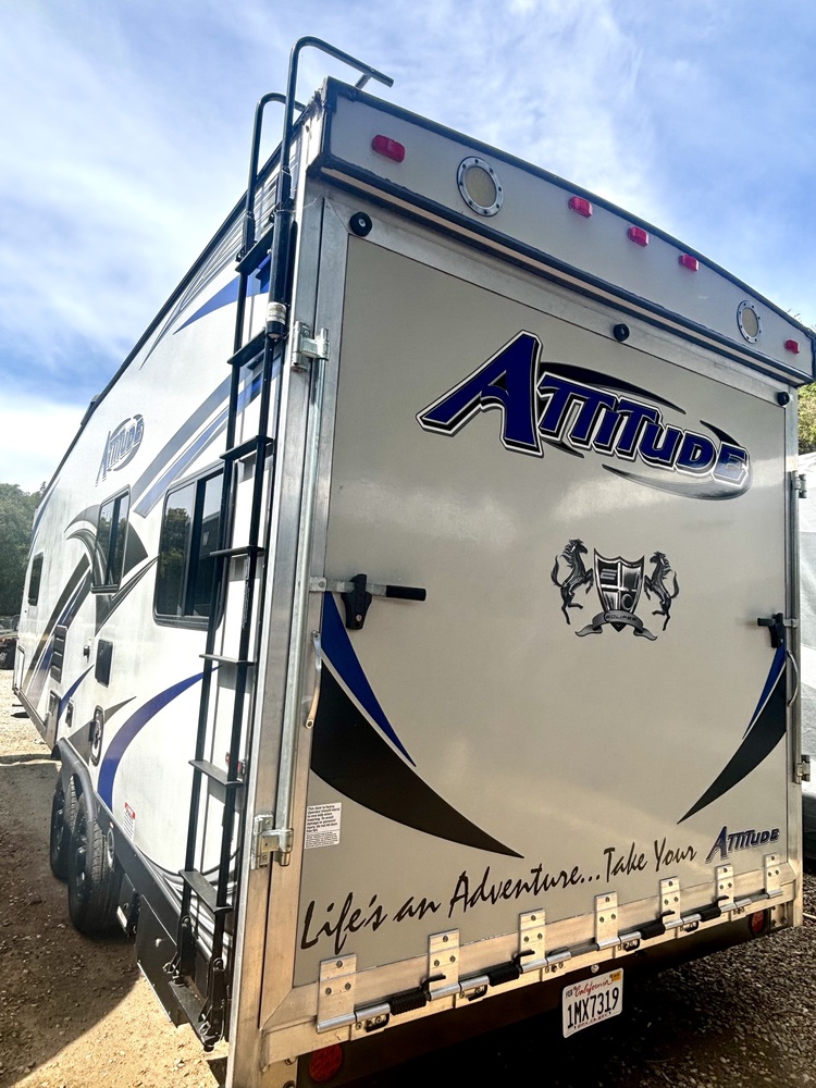 Unit Sleeps 6. Front private bedroom. Walk-around queen size bed with storage underneath, cubbies next to the bed with USB, charging ports, two wardrobe closets and an overhead cabinet. Full bathroom w/ceramic toilet, locked glass door corner shower with skylight, corner sink, medicine cabinet and built-in storage cubbies. Kitchen includes a large double door refrigerator/ freezer, three burner range w/hinged glass cover, double sink w/pull out faucet and lots of counter space. Overhead cabinets throughout. Large tinted windows with pull down fabric shades. Full-size electric bunk bed with ladder which stores neatly near the rear ceiling when not in use.