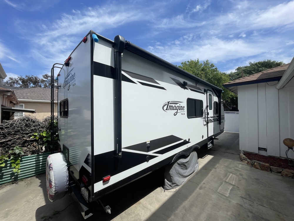 SOLD! 2020 Grand Design Imagine XLS 22MLE with residential sized queen bed, booth dinette, twin reclining theater seats with heat and vibrate options, power awning and power slide-out, max fan and A/C, indoor/outdoor speakers, and unobstructed pass through storage. Aftermarket add-on: Rear mounted camera. Replaced the cheap Chinese-made Westlake stock tires with Goodyears all around. Regular annual service with the dealer and all motorized pieces, seals and hoses are kept up. Brakes most recently serviced Dec. '24