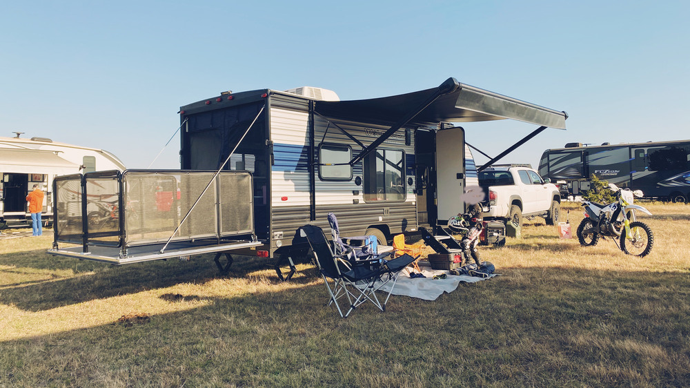 The Cherokee Wolf Pup is equipped with a spacious garage area in the rear, allowing you to bring along all your favorite toys, such as ATVs, motorcycles, or bicycles. The garage also doubles as a living space, with fold-down seating that can be converted into a bed, making it a great option for overnight stays.