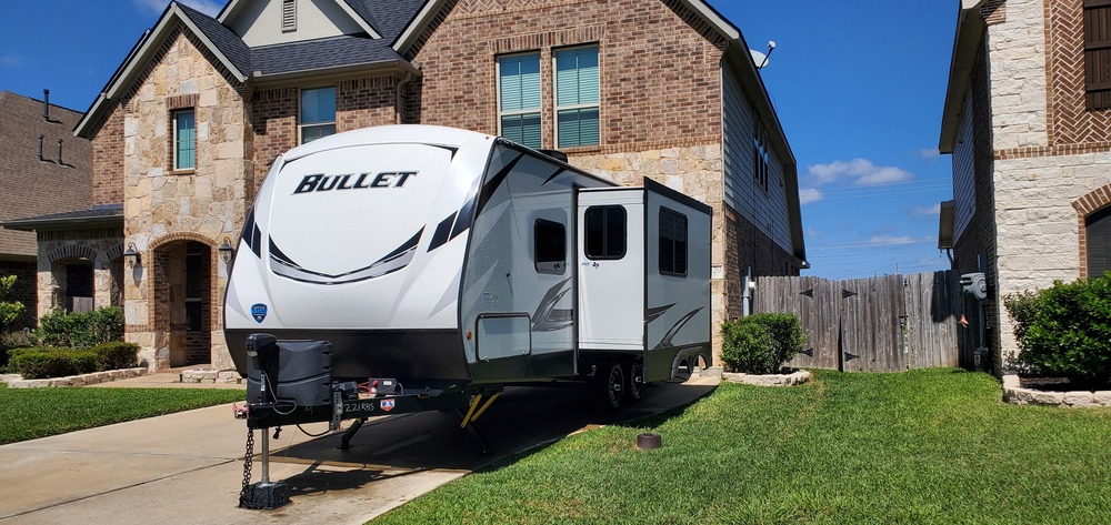 Outside, the Keystone Bullet 221RBS boasts a large awning for shade and protection from the elements The exterior is also equipped with a power tongue jack and stabilizer jacks for easy setup and leveling.