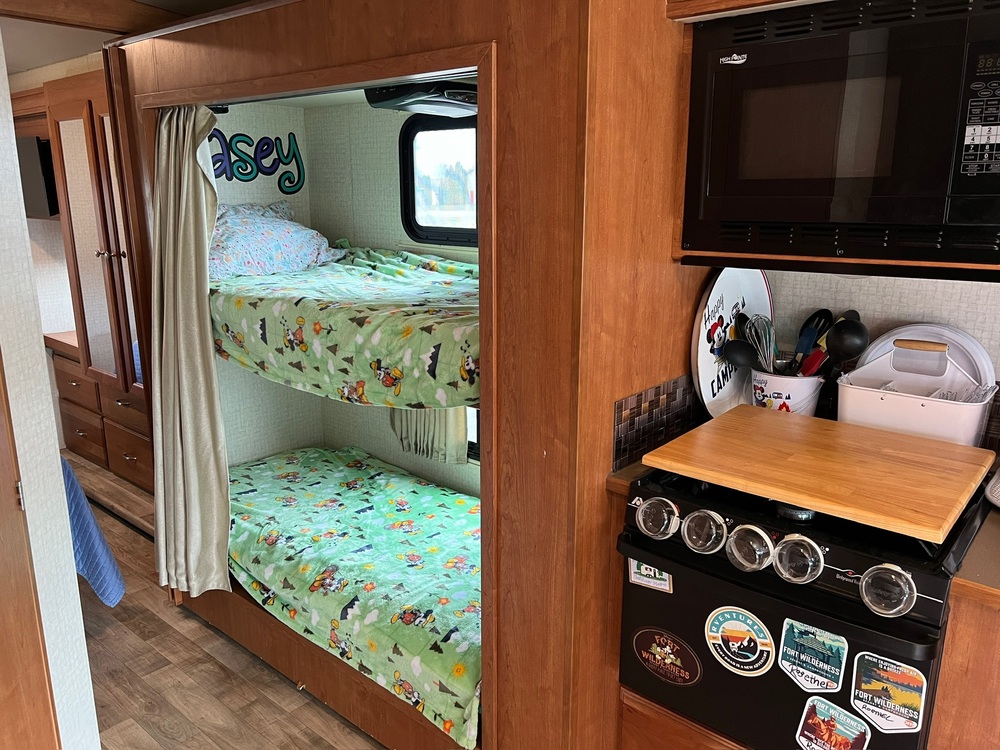 The Vista 31BE features a spacious interior layout, with a comfortable living area, fully equipped kitchen, and a cozy bedroom area. This floor plan includes 2 bunks as well as a 3rd drop down bunk, making it the perfect motorhome for a family. The kitchen is outfitted with modern appliances including a recently upgraded 12 volt DC refrigerator and ample storage space, making it easy to prepare meals on the go. The living area is perfect for relaxing or entertaining guests, with a dinette and sofa that can also double as extra sleeping space.