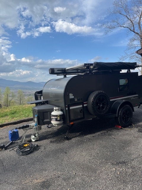 2022 inTech Flyer Pursue Custom trailer for sale. All-aluminum overlander with Lock-n-Roll articulating hitch, Ark Xtreme 270 off road trailer swivel jack, 200 watts roof-mounted solar, 240Ah Expion 360 lithium batteries, Victron MPMT DC/DC charger and battery monitor, Camco Olympian Wave 3 catalytic propane heater, OVS 270 awning with sidewall, ARB rear awning and integrated tent, JOOLCA shower/bathroom double awning, 2x20lb propane tanks. Slide-out kitchen with Dometic 60L refrigerator and two burner Dometic propane stove, off road tires with full size spare, Timbren suspension, roof-mounted a/c - heat, Maxx-Air DC fan. All upgrades professionally installed. Title in hand.