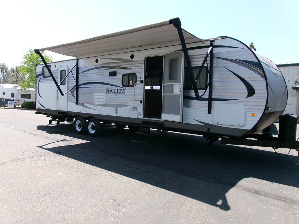THIS 2016 FOREST RIVER SALEM 32BHDS 2 BEDROOM 2 SLIDE BUNK HOUSE TRAVEL TRAILER IS IN GOOD CONDITION. THE SALEM IS EQUIPPED WITH THE BUNK ROOM THAT SLEEPS 4, DINNING BOOTH, QUEEN BED INFRONT, SWIVEL TV, SLEEPS 10, OUTDOOR KITCHEN WITH WASHER/DRYER, DUAL ENTRY, ELECTRIC LEVELING JACKS, OUTDOOR SPEAKERS, ELECTRIC AWNING, AND MUCH MORE!!