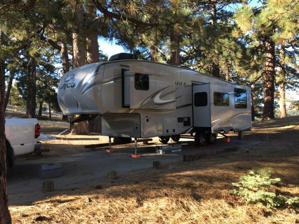 The fifth wheel includes 2 AC units, 2 10 gallon propane tanks, 2 deep cycle batteries, and electric landing gear and stabilizers with remote. The 2 slides, electric awning, and outside lights can also be accessed with remote control. It is wired for solar. The Jayco Eagle HT fifth wheel contains lots of storage both inside and out. Must see to appreciate.