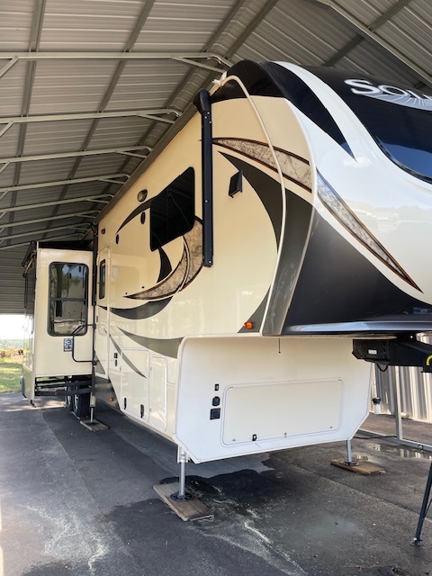 41 ft. 5th Wheel trailer with new transferable life-time warranty roof, 4 new 14ply. tires, auto leveling, 2 large a/c units, 5 slide outs, new slide out covers, sleeps 6 with 1 queen bed in master and 2 sleeper sofas, 2 new recliners with massage and heat, 2 T.V.s with dish receiver and stand, stacked washer and dryer, electric fireplace, Arctic insulation, tripod stabilizer, hoses, chocks, sewer line, extra electrical lines and dehumidifier.