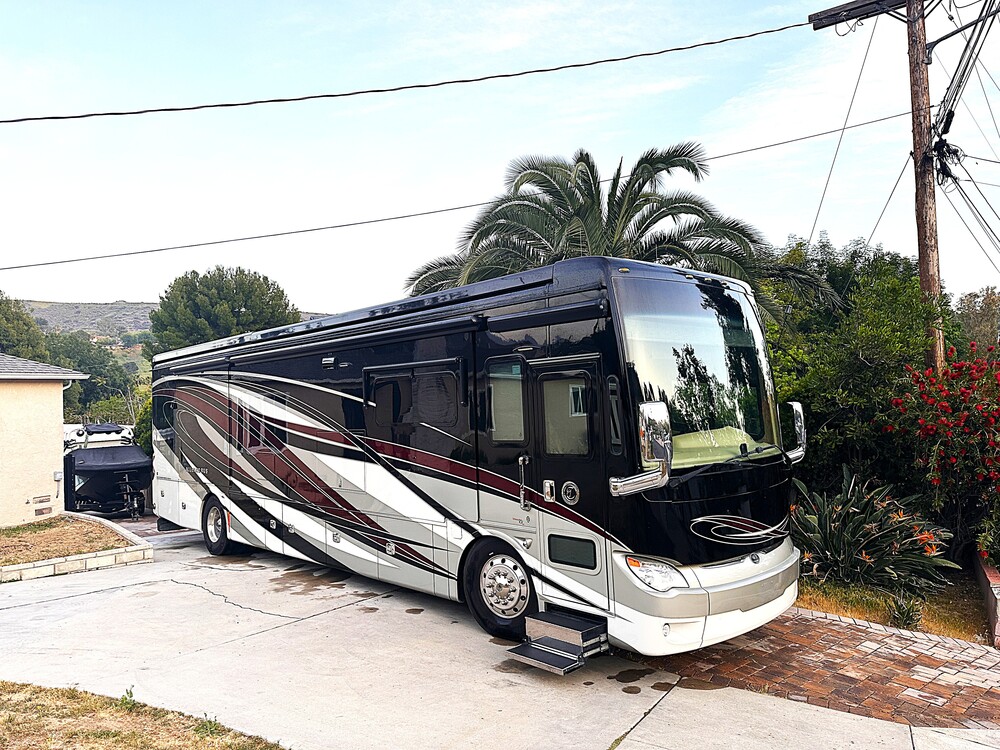 This RV is powered by an 8.9L Cummins ISL diesel engine that produces 450HP and 1,250 ft-lbs of torque, has the Allison 3000 MH 6-speed automatic transmission with electronic shifter, is equipped with an Onan 10.0kW Quiet Diesel generator, and sits on a heavy duty Tiffin PowerGlide chassis with air brakes, air ride suspension,
