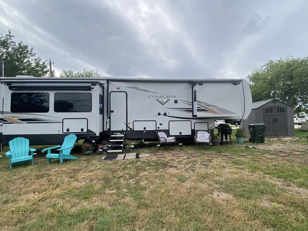 The 2022 Forest River Cedar Creek Champagne 38EBS is a top-of-the-line fifth wheel trailer designed for luxury and comfort on the road. With only 200 miles on the unit, this practically brand-new RV is perfect for those looking to travel in style. This Cedar Creek Champagne boasts many bonuses for serious RVrs with an outdoor grill, fridge, TV, speakers, outside shower, and 2 auto awnings to relax in the shade, and solar panels on the roof.