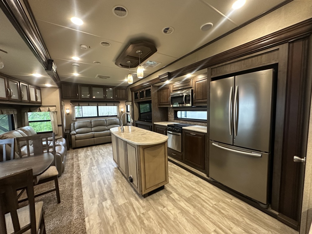 Enter and find a spacious combined kitchen and living area with dual opposing slides. There is seating to your immediate left as you enter, and along the rear wall. In the slide to your left you will enjoy a free standing dinette with four chairs, plus theater seating further down. Along the rear wall there is a hide-a-bed sofa with storage above. You can easily entertain guest here, and it also provide sleeping space to overnight guests.