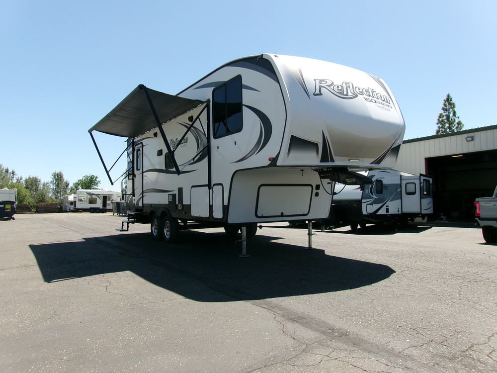 THIS 2018 GRAND DESIGN REFLECTION 230RL 150 SERIES SHORT 5TH WHEEL IS IN IMMACULATE CONDITION!! THE REFLECTION IS ONLY 28' WITH A SLIDE. IT IS EQUIPPED WITH THE ARTIC PACKAGE, DINNING BOOTH, TV, LEATHER MASSAGE RECLINERS, TV, WALK AROUND QUEEN BED INFRONT, SLEEPS 4, SOLAR READY, OUTDOOR SPEAKERS, ELECTRIC AWNING, AND MUCH MORE.
