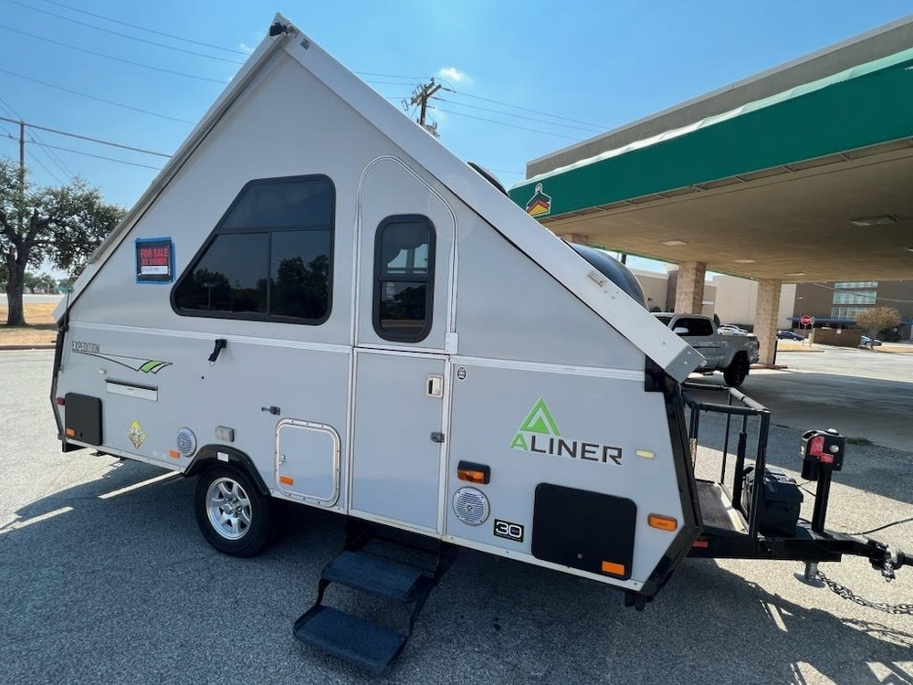 Clean 2014 Expedition A-liner in excellent condition offering a versatile and convenient camping experience. Features a rear sofa layout with dinette that converts to accommodate the included commercial queen mattress. The A-liner has a microwave, refrigerator, 2-burner stove and a swivel cassette toilet. The air conditioner has been upgraded and comes with a cover. Mounted double fans have also been added for additional comfort. A 3000-watt electric start Honda generator has been professionally mounted on the back and comes with a cover. The Expedition A-liner is 18 feet in overall length. Dry weight is 2250 lbs., gross vehicle weight rating & axle rating is 3,500 lbs. and dry hitch weight is 240 lbs.