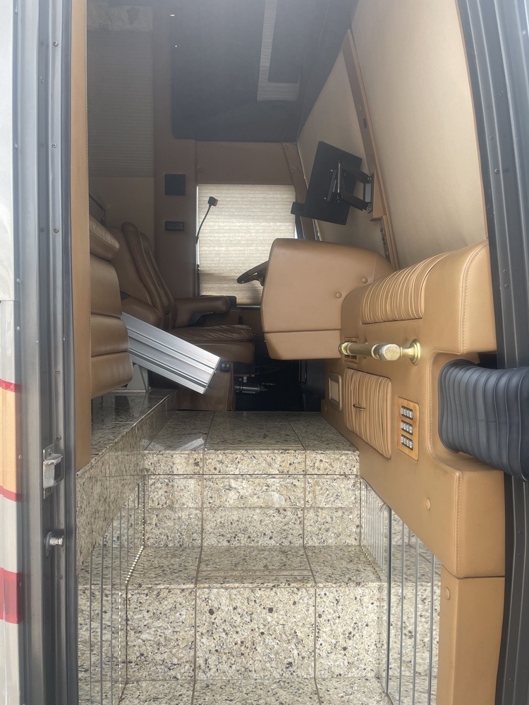 This coach was manufactured new with a wheelchair lift on the side of the ciach and a standard front entrance, open floor plan with over sided door ways and low profile shower and vanity fir handicap use , it is also equipped with four A/C units , Aquahot heating system, a17.5 KW diesel generator, with two 4000 watt Inverters, automatic patio awnings, granite floors, and much more, priced to sell , $469,000.00 also a remote controlled trailer