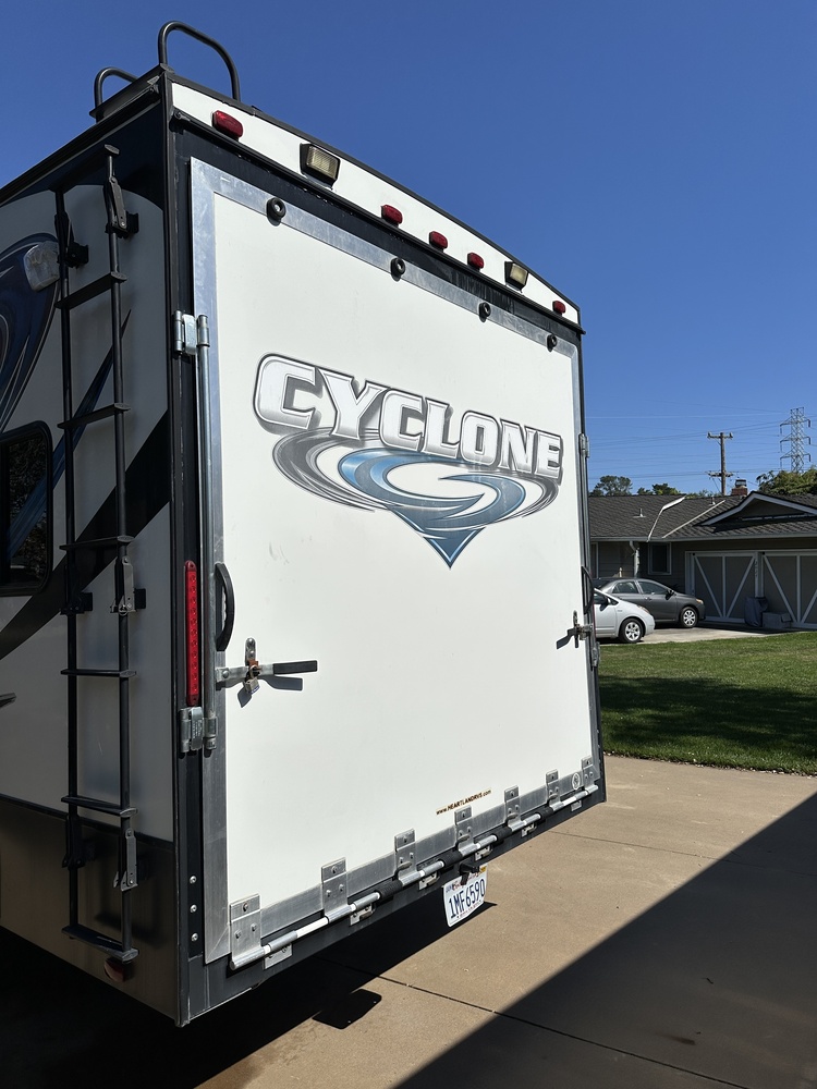 Inside, you'll find a fully-equipped kitchen with modern appliances, a cozy living area with comfortable seating, a dining table for family meals, and a luxurious master bedroom for restful nights on the road. The sleek exterior design of the Cyclone is sure to turn heads wherever you go, and the attention to detail is evident in every aspect of this RV.