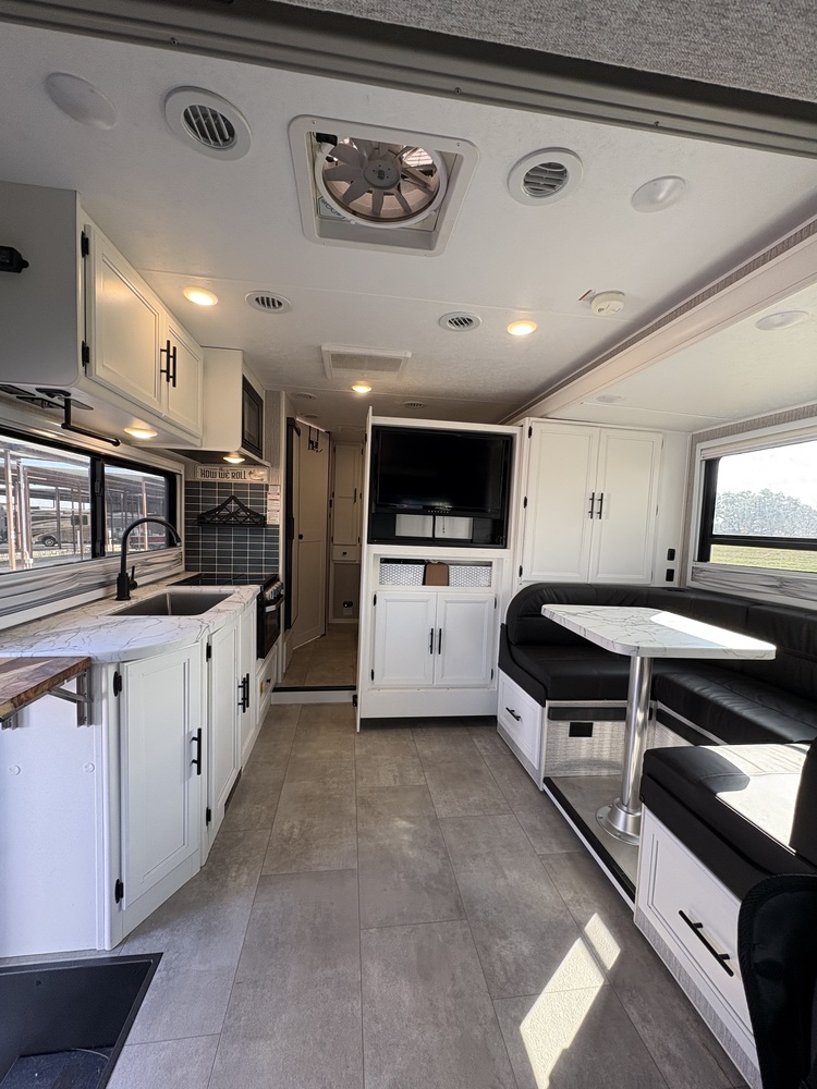 U-shaped dinette with comfortable seating and a slide out TV for entertainment. The dinette converts into a full size bed. The bedroom includes a queen size bed and a closet with rod.