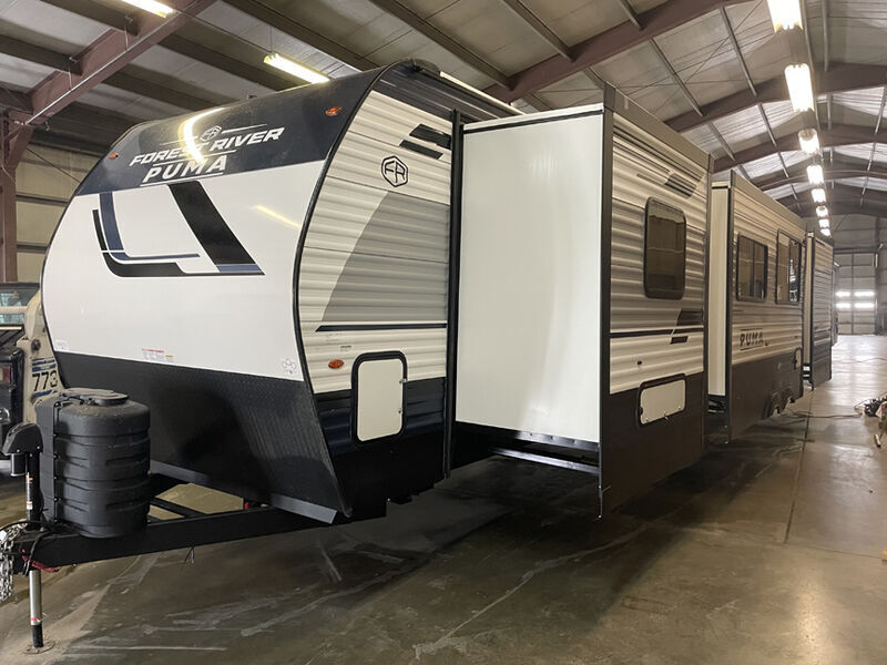 OWN THIS UNIT FOR ONLY $366.51 per month w/ approved credit! This Triple Slide Lay-Out features a couch/dinette slide, a bunk room slide, and a bedroom slide! This Trailer sleeps 9 & weighs 8,917lbs! This Trailer is equipped with ducted 15,000BTU A/C, second 13,500BTU A/C in Bedroom, Power Awning w/ LED Light Strip, LED Lighting throughout Interior of Unit, Microwave, TV Antenna, AM/FM/BLUETOOTH Stereo w/ Exterior Speakers, 32" LED TV,11 Cubic Foot 12 Volt Refrigerator, 6 Gallon Gas/Electric Water Heater w/ DSI, Upgraded Oven w/ Glass Stove cover, 35,000BTU Furnace, Fireplace, Washer/Dryer Prep w/ 50 AMP Service, Night Shades, Jack Knife Sofa w/ fold down cup holders, Exterior Grab Handle, Outside Shower, Black Tank Flush, Rear Ladder, Front Rock guard, Solar Panel Hook Ups, Prewired for a back up camera, Enclosed Underbelly, Power Tongue Jack, Power Stabilizer Jacks, Upgraded Triple Solid Step Entry Steps, Aluminum Wheels, and Spare Tire. This unit also comes equipped with an Outside Kitchen featuring a 110 Refrigerator, Microwave, Sink, and a Griddle Cooktop!