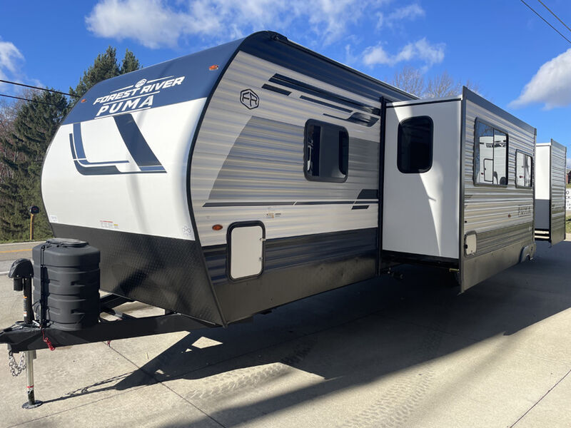 OWN THIS UNIT FOR ONLY $338.25 per month w/ approved credit! This Trailer features a HUGE rear bunk area, 2 slide-outs, and only weighs 8,386lbs! This Trailer is equipped Aluminum Siding, ducted 15,000BTU A/C 50 AMP Service & a Second 13,500BTU A/C in the master bedroom, Power Awning, LED Lighting throughout, Stainless Steel Appliances, Microwave, TV Antenna, 40" LED TV, AM/FM/Bluetooth Stereo w/ Soundbar and Exterior Speakers, Fireplace, 11 Cubic Foot 12 Volt Refrigerator, 6 Gallon Gas/Electric Water Heater w/ DSI, Oven w/ Glass Stove cover, Furnace, Night Shades, Exterior Grab Handle, Outside Shower, Black Tank Flush, Aluminum Solid Triple Step, Rockguard, 20lb# LP Tanks, Rear Ladder, Solar Panel Hook Ups, Prewired for a back up camera, Battery Disconnect, Enclosed Underbelly, Stabilizer Jacks, Power Tongue Jack & Power Stabilizer Jacks, Aluminum Wheels, and Spare Tire.