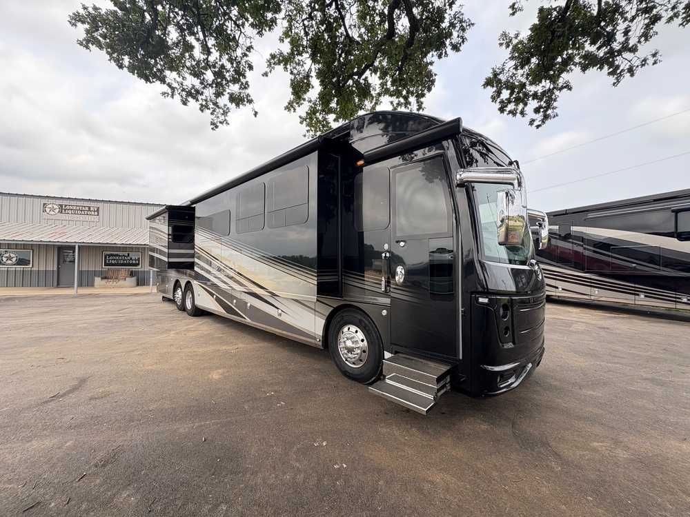 2017 American Coach Eagle 45C Bath & 1/2 with 3 slides and 34,972 miles. This coach is 45 feet in length and features a Cummins 600HP engine with side radiator, 2-stage engine brake, raised rail chassis with IFS and tag axle, tilt/telescoping smart wheel, power privacy shade, power mirrors with heat, power pedals, power window, power step well cover, 12.5KW Onan generator with AGS on a power slide, power patio and door awning, power window awning, slide-out room toppers, Aqua Hot, 50 amp power cord reel, pass-thru storage with side swing baggage doors, 2 full length slide-out cargo trays, aluminum wheels, black tank rinsing system, water filtration system, power water hose reel, exterior shower, fiberglass roof, 15K lb. hitch, automatic air leveling system, 3 camera monitoring system, exterior entertainment center, inverter, tile floors, soft touch ceilings, multiplex lighting, dual pane windows, power solar/black-out shades, power roof vent, decorative ceiling features, fireplace, convection microwave, 2 burner electric flat top range, solid surface counter, sink covers, central vacuum, residential fridge, stack washer/dryer, tile accented glass door shower with seat, wall hugger adjustable king size bed, 4 flat panel TV's, 3 ducted A/Cs and much more.