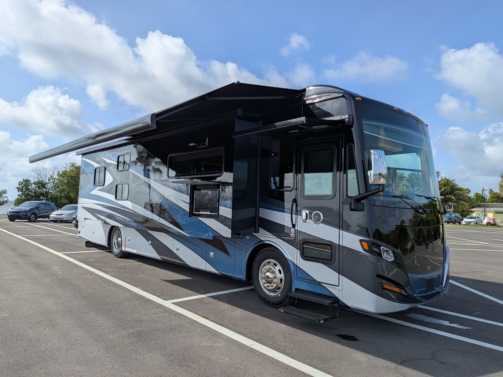 The 38 KA model is perfect for a family of 4-6 with hard-to-find bunk beds, theater seating, 1 + 1/2 bathrooms, 4 TVs, wifi ranger, and tons of storage space. In addition to the bunks and queen-sized bed there is more sleeping space with the convertible dinette and drop down bed over the driver. Lots of convenience with full-size residential fridge and microwave, built-in washer/dryer, dishwasher, central vacuum, solar panel, dual A/Cs, on-demand water heater, in-floor cabin heating and fireplace. Spyder central digital control for lighting and HVAC with mobile app and dual awnings for outdoor entertaining.