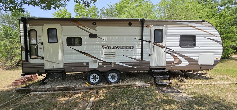 Enjoy your time away from home camping in the Wildwood WD27RLSS travel trailer by Forest River. This model features one large slide out with a large rear window with two swivel rockers. Park at a lake site and enjoy the site out the window while dinner is being prepared in the central kitchen with dinette and floor to ceiling refrigerator. On one wall of the dinette is a large TV, viewable from the lounge chairs. There are also many large cabinets to store supplies. The large bath with a comfortable enclosed shower is central toward the rear. Next is the bedroom with a queen-size bed with floor space around 75% of the bed. The bedroom also has a TV connection. This used RV has been taken very good care of since it was purchased new in 2016. The wood throughout the trailer is like new.