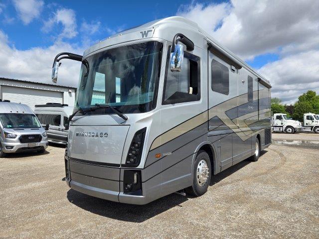 2024 Winnenbago Journey 34N, 35’6”, Three Slides, 8.9L ISL Cummins, 380 HP, Freightliner Maxum II XCM Chassis, NeWay Air Suspension w/ V-Ride, 8,000 Watt Onan Diesel Generator, Automatic Generator Start System, 3,000 Watt Inverter, 4) 130 Amp Hour Lithium Batteries w/ 3) 115 Watt Solar Panels, PS, Dash Air, Cruise, Tilt/Telescopic Steering Column, High Mounted Power Mirrors w/ Defrost, Powered Blackout Roller Visor/Shade For Windshield, Power Driver & Passenger Seats w/ Swivel & Recline, +Lounger Passenger Cab Seat w/ Footrest & Flip-Up Workstation, 12.3” LCD Color Touchscreen, Infotainment/GPS Navigation System & Satellite Radio/USB, Back-Up & Side View Cameras, Automatic Hydraulic Leveling Jacks, Exterior Entertainment Center w/ 43” TV, Soundbar System w/ Portable Bluetooth Subwoofer, PortableExterior Fridge & Freezer12V/120V, Aluminum Wheels, Pet Pal Leash Tie Down, Electric Step, Outside Shower, Push Button Release Compartment Doors w/ Powered Close, 2) 15,000 BTU Roof AC Units w/ One Heat Pump, AquaHot 400D Heating System, Tankless Water Heater w/ Recirculating Pump, Heated Holding Tank Compartment, 7” Touchscreen Monitor Panel, Multi-PlexWall Switches, Dual Pane Windows, Solar/Blackout Roller Shades, Powered Ventilator Fan, 50” Smart HDTV, Home Theater Sound Bar System, WiFi Router w/ Winegard Air 360+ Antenna, USB Chargers, Electric Fireplace, Hydronic Heated Floor, Central Vacuum System, 2 Burner Portable Induction Range Top, Convection Microwave Oven, 2 Door Residential Fridge/Freezer – 24 Cu. Ft. w/ Water Dispenser, Dual Ice Maker & Bottom Freezer, Stainless Steel Dishwasher, Sink, Pantry, Glide & Dine Dining Table & Chairs, Buffet, Rest Easy Sofa, 2 Versatile Chottomans (Footrests/Seating/Storage), Vanity Counter, Shower w/ Seat & Dual Showerheads, Maxxair Powered Roof Vent w Rain Sensor, Washer & Dyer, Customizable Wardrobe, Ceiling Fan, 43” UHD Smart TV in Bedroom, King Island Bed w/ Power Incline Headrest, Sleeps 4, 22’ Carefree Apex Powered Patio Awning w/ LED Lighting & Wind Sensor, Retractable Entry Door Awning, Slide-Out Awnings, Hewing Interior (Beige), Walnut Wood, Midnight Canyon Exterior