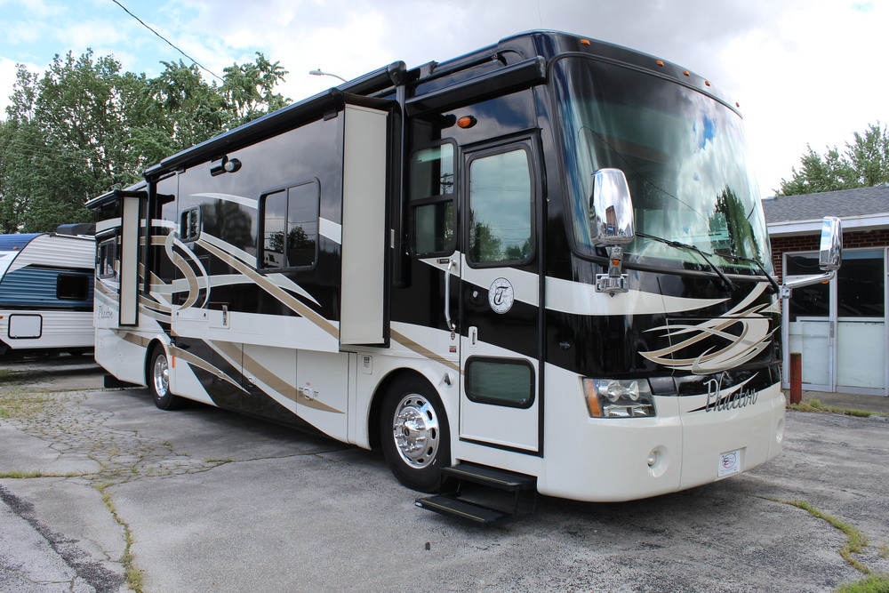 Very clean Class A 36' diesel Motorhome, rear bedroom with queen bed and opposing slide outs, wash sink/vanity in bedroom, wardrobe closet with mirrored sliding doors, washer/dryer, rectangle shower with glass doors and skylight, kitchen/living area with opposing slides, dinette booth, sofa, love seat, residential style fridge with bottom freezer and double door fridge, 3 burner stove/oven, dual basin stainless steel sink, over the range microwave, ducted A/C and furnace, slide out toppers on all 4 slide outs, 360 Cummins, 6.7isl, 67,000miles, Michelin tires, sleeps 6