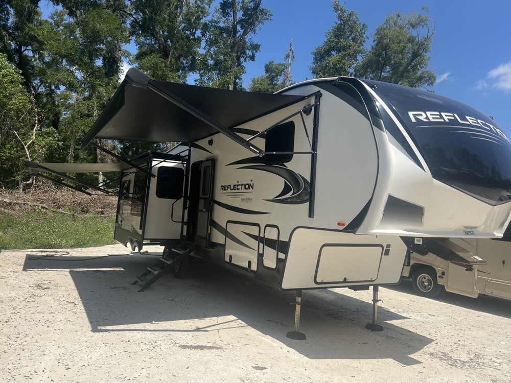 This is the best deal on a Grand Design Reflection 337RLS by far! In immaculate condition inside and out. 35 feet long, two roof AC units, three power slide outs, two power, patio awnings, automatic electric stabilizer jacks, four-door refrigerator, fireplace, washer, dryer, hook ups, oversize garage/storage area, huge bathroom, queen size bed with a very large closet. Ready to camp and needs nothing. do some research and you will see that this will not last long at this price, especially once you see it in person.