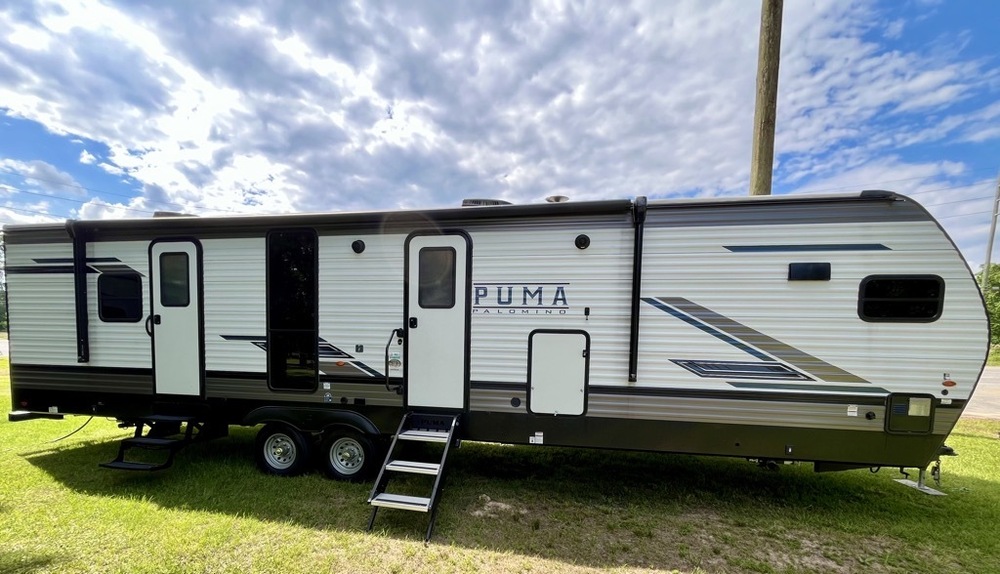 2023 FOREST RIVER PUMA 38ft 2 SLIDES WASHER DRYER READY. 2 AC’s . REAR KING walk around bed . And wardrobe closet with washer, dryer connections private bath with Glass enclosed shower. FRONT KITCHEN center living room area with reclining loveseat and dining table in slide. Across from kitchen . and entertainment center with fireplace and sofa sleeper. full size refrigerator. lots cabinets for storage Full-size pantry. has central AC' 15000 BTU central ac and a second AC in the bedroom and Central heat .50 amp service, 6.5 gal gas/elc water heater with DSI. electric roll out awning with built in LED lights . one owner indoor stored. Only used a few times since purchased New. excellent Condition everything works will demonstrate . Actual photos, clean title $26,900 (832) 253-3336