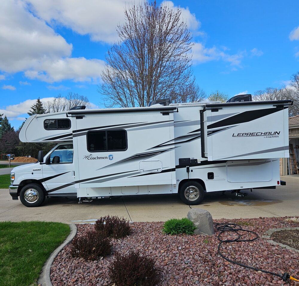 Selling our 2024 Coachman Leprechaun 260DS. This unit is built on the Ford E450 chassis with a 7.3 Liter V8 engine and 5080 miles. The options are too many to list but a few highlights are 200W solar panels with Yamaha generator and auto start, automatic leveling hydraulic jacks, outdoor entertainment center, dual AC, theater seating with dual reclining heated seats, dinette across from recliners for entertaining, tankless water heater. Selling due to a change in our retirement planning, this unit is like new! $87,900 or best offer.