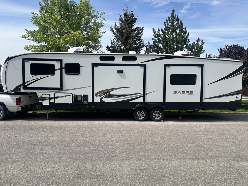 Used 2022 FOREST RIVER SABRE 37FLH for sale. Nice layout, great condition, very comfortable, 5 slides, sleeps 6. Front living room w twin (vibrating) recliners facing a 55” tv and elec fireplace. Two foldout couches. Kitchen has Large refrigerator with 2 freezer drawers, farm sink with Moen faucet, half bath. King size bed with mounted tv. Bathroom has two sinks and lots of counter and cabinet space. 10 gal hot water. Fresh/grey/black is 49/76/76 gal. Outside sink n fridge. Pass through storage. Self leveling.