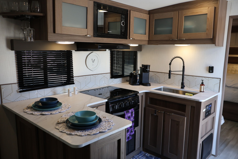 Outdoor storage includes a large pass through basement and a 8x6 bumper storage box for all your extra camping gear.
