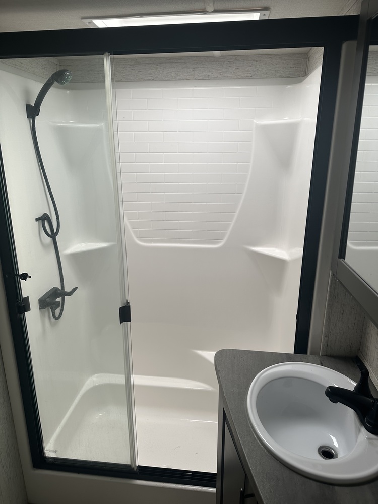 Moving to the rear of the RV, you'll find the garage area which is perfect for hauling your outdoor gear, motorcycles, or ATVs. The ramp door makes loading and unloading a breeze, and the tie-downs ensure that your equipment stays secure during travel. The garage can also be converted into additional living space with the automatic bed that moves up and down and you can convert the two benchs into a bed.The garage has been updated with sliding glass doors in lieu of the cheap plastic slides.
