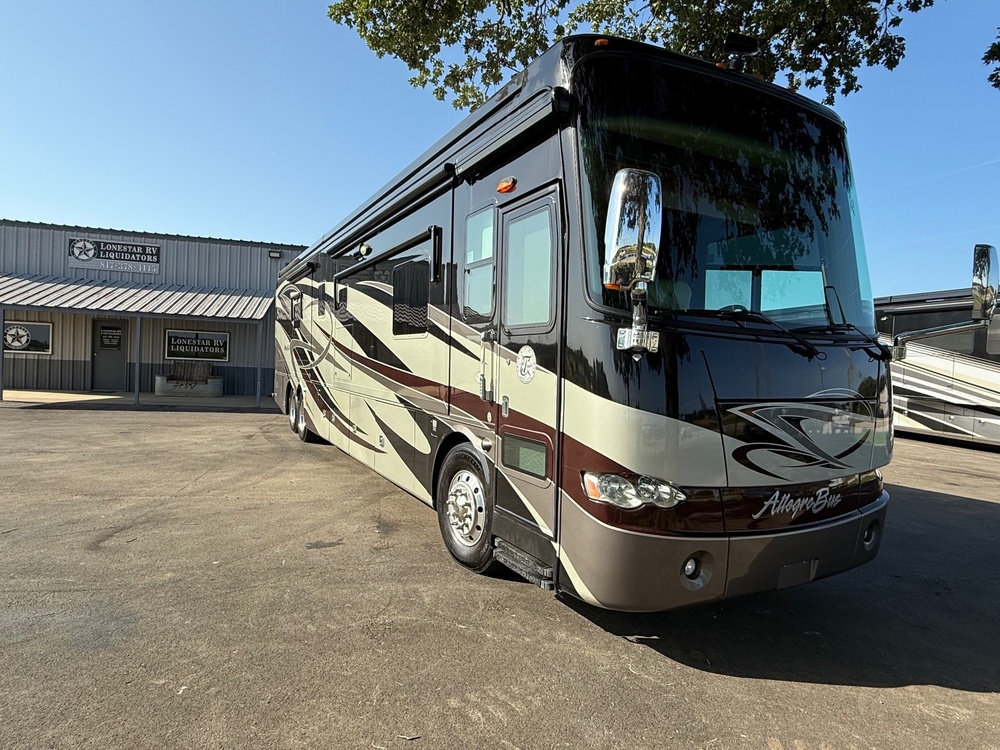 2012 Tiffin Allegro 43QGP with 4 slides and 39,475 miles. This bath & 1/2 RV is 44 feet in length with a 450HP Cummins engine with side radiator, Power Glide raised rail chassis with IGS and tag axle, power mirrors with heat, GPS, 10KW generator with AGS on slide, Girard power patio and door awnings, window awnings, slide-out room toppers, Aqua Hot, 50 Amp power cord reel, pass-thru storage with side swing baggage doors, full length slide out cargo tray, aluminum wheels, power water hose reel, solar panel, automatic hydraulic leveling system, color 3 camera monitoring system, exterior entertainment center, Magnum inverter, ceramic tile floors, 7 foot soft touch ceilings with decorative features, multi-plex lighting, dual pane windows, dishwasher, solid surface counter, washer/dryer stack, convection microwave, king size bed, safe, 3 door residential refrigerator, 3 ducted roof A/Cs with heat pumps and 4 LCD TV.